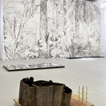 Dessin mural au fusain, bois, écorces de sapin, laiton, verre, miroir, bitume, bâche en PVC découpée, dimensions variables