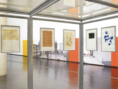 Verre et acier galvanisé, 20 dessins encadrés 216 x 470 x 280 cm